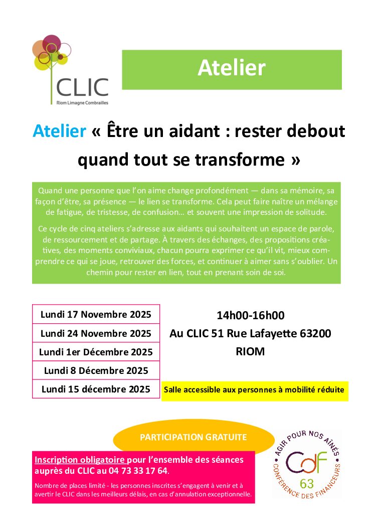 Participation gratuite Inscription au CLIC au 04 73 33 17 64.